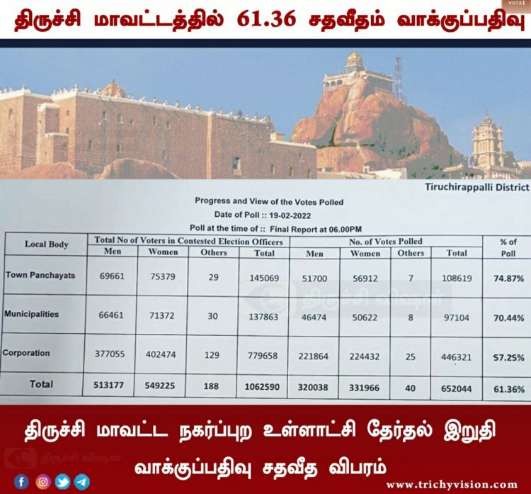 திருச்சி மாவட்டத்தில் நகர்ப்புற உள்ளாட்சி தேர்தல் மாநகராட்சியில் உள்ள 65 வார்டுகள் நகராட்சி பேரூராட்சிகளில் உள்ள 398 வார்டுகளில் நேற்று(19.02.2022) வாக்குப்பதிவு நடைபெற்றது.நகர்ப்புற உள்ளாட்சி தேர்தலில் திருச்சி மாவட்டத்தில் இறுதி நிலவரப்படி 61.36 சதவீத வாக்குகள் பதிவவாகியுள்ளது.