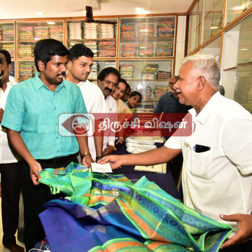தொடர்ந்து திருச்சி ஜங்ஷன் ரயில் நிலையம் எதிரே உள்ள காதி கிராப்ட் வளாகத்தில் காந்தி திருவுருவ படத்தை மாவட்ட ஆட்சியர் பிரதீப் குமார், மாநகராட்சி ஆணையர் வைத்தியநாதன், மேயர் அன்பழகன் ஆகியோர் திறந்து வைத்தனர். தொடர்ந்து காதி கிராப்ட்-ல் தீபாவளி கதர் சிறப்பு விற்பனையை துவக்கி வைத்தனர்.