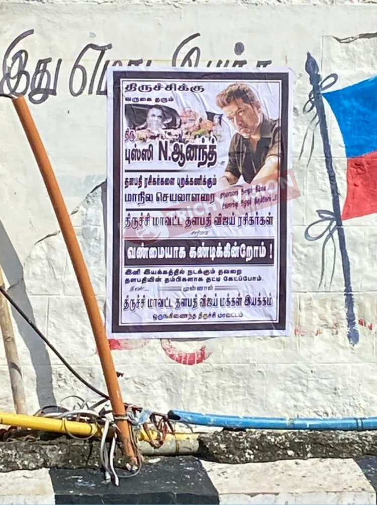 இந்நிலையில் இவருடைய வருகைக்கு எதிர்ப்பு தெரிவித்து திருச்சி மாநகர் முழுவதும் சுவரொட்டிகள் ஒட்டப்பட்டுள்ளன. இதில் தளபதி ரசிகர்களை புறக்கணிக்கும் மாநிலச் பொதுச்செயலாளரை திருச்சி மாவட்ட தளபதி விஜய் ரசிகர் சார்பாக வன்மையாக கண்டிக்கிறோம். இனி இயக்கத்தின் நடக்கும் தவறை தட்டிக் கேட்போம் என திருச்சி மாவட்ட தளபதி விஜய் மக்கள் இயக்கத்தினர் சுவரெட்டியில் குறிப்பிட்டுள்ளனர்.