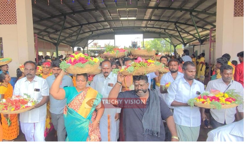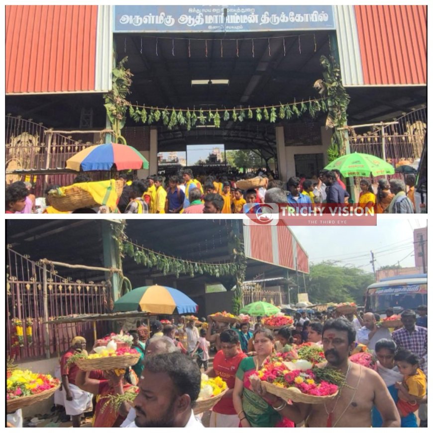 காலை 09:30 மணிக்கு சமயபுரம் மாரியம்மன் கோயில் இணை ஆணையர் கல்யாணி, மணியக்காரர் பழனிவேல், கோயில் குருக்கள் மற்றும் ஊழியர்கள் கோயிலின் முன்புறத்தில் இருந்து பூ தட்டுகளை ஏந்தி மேளதாளங்கள் முழங்க, அதிர்வேட்டு முழங்க ஆதிமாரியம்மன் கோவிலை வலம் வந்து கோயிலுக்குள் வந்தனர்.