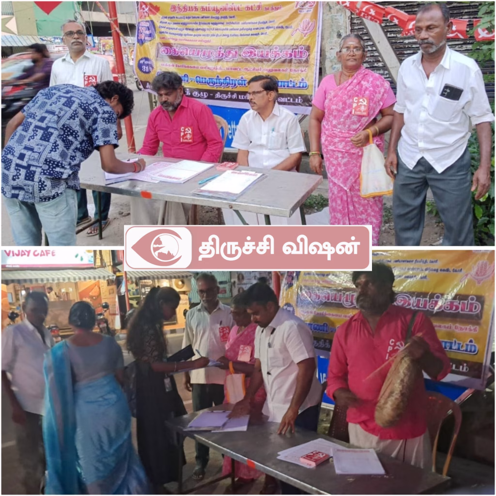 மகாத்மா காந்தி கிராமப்புற வேலைவாய்ப்பு உறுதி திட்டத்திற்கு அதிக நிதி ஒதுக்கியும் முழுமையான வேலை வழங்கிடவும், நகர் புறங்களுக்கு 100 நாள் வேலை திட்டத்தை விரிவுபடுத்த கோரி இந்திய கம்யூனிஸ்ட் கட்சி சார்பில் திருச்சி மாநகர் மாவட்டத்தில் மேற்கு தொகுதிக்குட்பட்டபகுதிகளில் மக்கள் கோரிக்கை கையெழுத்து இயக்கம் ஜூலை 21 ம் தேதி காலை 10 மணிக்கு மேற்குப் பகுதி செயலாளர் இரா சுரேஷ் முத்துசாமி தலைமையில் துவங்கியது. ஜூலை 21ஆம் தேதி மாலை எட்டாவது வார்டு பாண்டமங்கலம் பகுதியில் தோழர் R.சரண்சிங் தலைமையிலும் ஜூலை 22 மாலை 6:00 மணிக்கு 9 வது வார்டில் ஆனந்தன் தலைமையிலும்