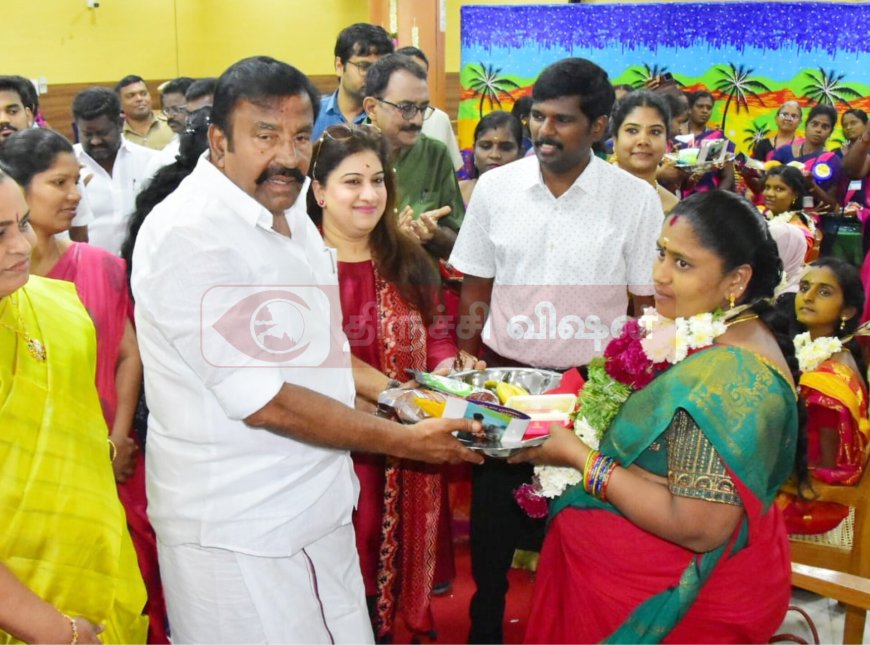 திருச்சிராப்பள்ளி மாவட்ட ஆட்சியர் அலுவலக வளாக கூட்டரங்கில் ஒருங்கிணைந்த குழந்தைகள் வளர்ச்சித் திட்டத்தின் சார்பில் தாய்சேய் நலனை மேம்படுத்தும் வகையில் மாவட்ட ஆட்சித்தலைவர் மா.பிரதீப்குமார் தலைமையில் நடைபெற்ற சமுதாய வளைகாப்பு விழாவில், மாண்புமிகு நகராட்சி நிருவாகத் துறை அமைச்சர் கே.என்.நேரு இன்று (23.02.2025) கலந்து கொண்டு, கர்ப்பிணி பெண்களுக்கு மங்கலப் பொருட்களான வளையல், மங்கலநாண், மஞ்சள், குங்குமம், வெற்றிலை, பாக்கு, தேங்காய், பழங்கள், வேப்பம் காப்பு, மாலை மற்றும் கர்ப்பகாலம் குறித்த துண்டு பிரசங்களை வழங்கி வாழ்த்தினார்.