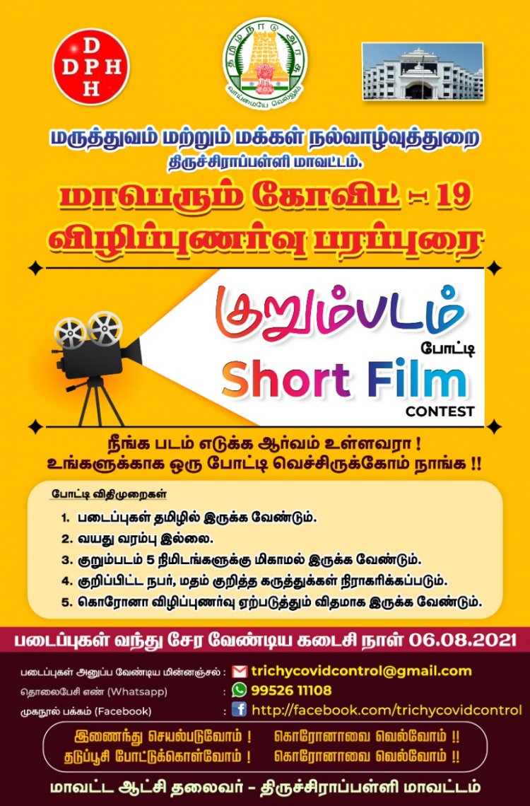 வயது வரம்பு இல்லை. குறும்படம் 5 நிமிடங்களுக்கு மிகாமல் இருக்க வேண்டும். குறிப்பிட்ட நபர், மதம் குறித்த கருத்துக்கள் நிராகரிக்கப்படும். கொரோனா விழிப்புணர்வு ஏற்படுத்தும் விதமாக இருக்க வேண்டும்.