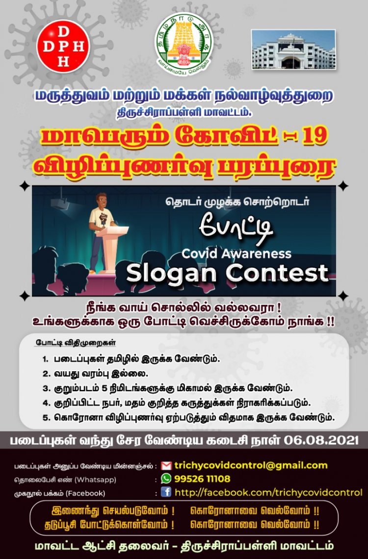 விழிப்புணர்வு போட்டிகள் நடைபெற இருக்கின்றது. இப்போட்டிகள் குறித்து மாவட்ட ஆட்சியர் வெளியிட்டுள்ள அறிக்கையில் குறிப்பிட்டிருப்பதாவது, குறும்படபோட்டி, மீம் (MEME) உருவாக்கும் போட்டி, தொடர் முழக்க சொற்றொடர் போட்டி (Covid Awareness Slogan) கொரானா விழிப்புணர்வு ஒட்டிகள் உருவாக்கம். (Covid Awareness Poster Designing) ஆகியவை நடைபெறவுள்ளது.
