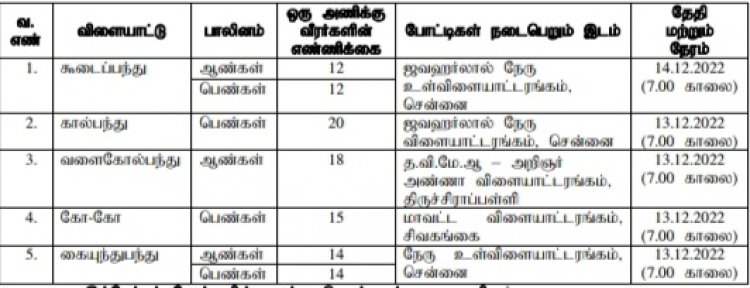ஏப்ரல் 2023 வரை நடைபெறவுள்ள பல்வேறு போட்டிகளில் தமிழ்நாடு அணிக்கான வீரர் மற்றும் வீராங்கனைகளை பின்வரும் விளையாட்டுகளுக்கு போட்டிகள் நடைபெறவுள்ளது.