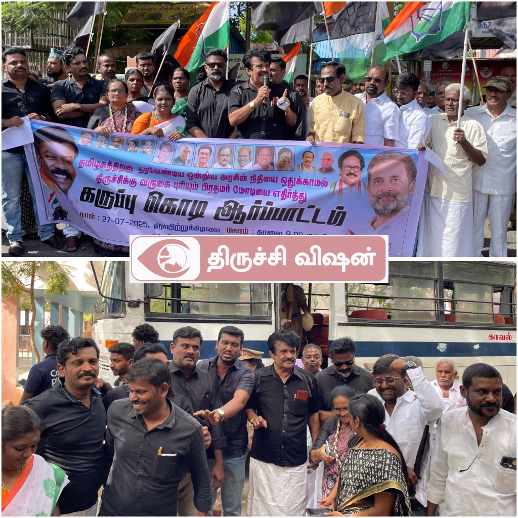ஜனநாயகத்தை குழி தோண்டி புதைத்து, சிறுபான்மையினரையும் ஓபிசி மற்றும் எஸ்சி எஸ்டி பிரிவினரை ஒடுக்கி, அனைத்து தமிழ்நாட்டு நலன்களையும் நிதிகளையும் மறுக்கும் பிரதமர் மோடி அவர்களின் திருச்சிக்கு வருகையை கண்டித்து கருப்பு கொடி ஏந்தி ஆர்ப்பாட்டம்