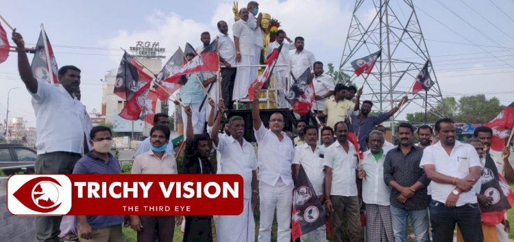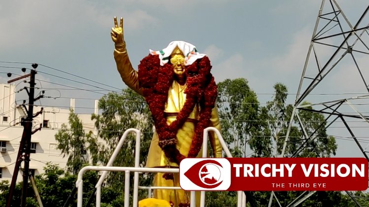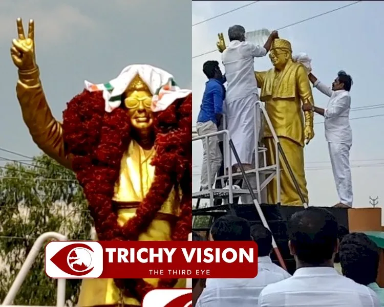 திருச்சி எம்ஜிஆர் தலையில் காங்கிரஸ் துண்டு – பரிகாரம் செய்த அமைச்சர்!!