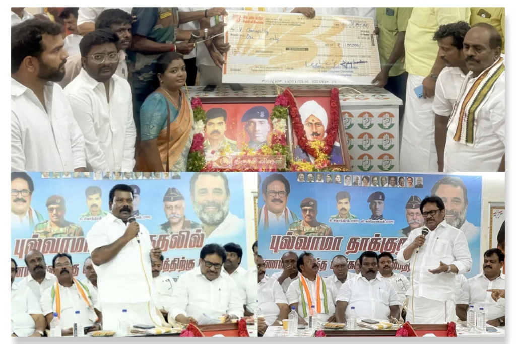 புல்வாமா தாக்குதலில் வீர மரணம் அடைந்த ராணுவ வீரர்கள் சி. சிவசந்திரன், (CRPF) ஜி. சுப்பிரமணியன் (CRPF) ஆகியோருக்கு மரியாதை செலுத்தி, குடும்பத்தினருக்கு அகில இந்திய காங்கிரஸ் கமிட்டி சார்பாக, தலா ஒரு லட்சத்திற்கான  காசோலையினை, தமிழ்நாடு காங்கிரஸ் கமிட்டி மாநிலத் தலைவர் கு. செல்வப்பெருந்தகை MLA அவர்கள் தலைமையில், தமிழ்நாடு காங்கிரஸ் கமிட்டி முன்னாள் மாநில தலைவர் சு. திருநாவுக்கரசர் Ex. MP அவர்கள் முன்னிலையில், திருச்சி மாநகர் மாவட்ட தலைவர், கவுன்சிலர் எல். ரெக்ஸ், தெற்கு மாவட்ட தலைவர் கவுன்சிலர் கோவிந்தராஜ், வடக்கு மாவட்ட தலைவர் கலை, முன்னாள் ராணுவத்தினர் அணி மாநிலத் தலைவர் ராஜசேகரன்,  ஆகியோர் கலந்துகொண்டு வழங்கினர்.