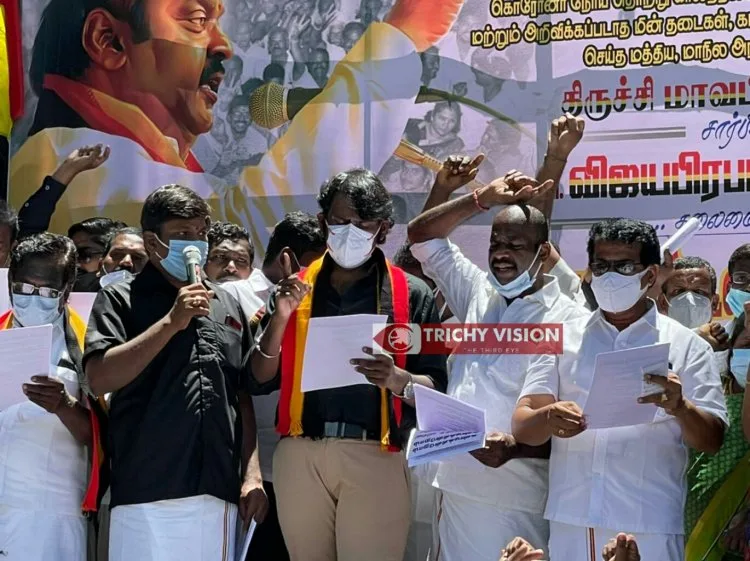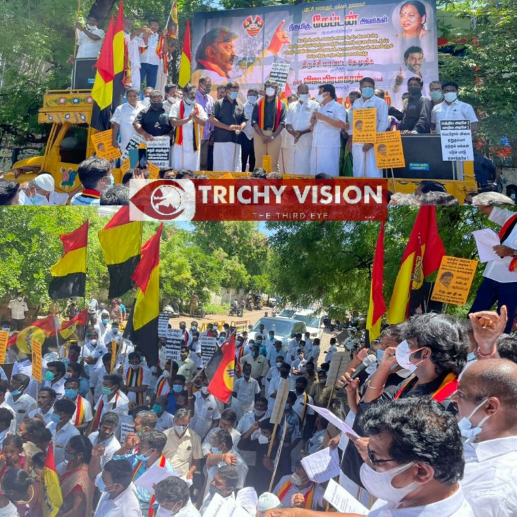 பெட்ரோல், டீசல், கியாஸ் விலை உயர்வு, கொரோனா நோய்தொற்று காலத்தில் டாஸ்மாக் மதுபான கடைகள் திறப்பு மற்றும் அறிவிக்கப்படாத மின் தடை, கட்டுமான பொருட்கள் விலை ஏற்றம் செய்த மத்திய மாநில அரசுகளை கண்டித்து திருச்சி மாவட்ட தேமுதிக சார்பில் தேமுதிக தலைவர் விஜயகாந்த் விஜயகாந்த் இளைய மகன் விஜய பிரபாகரன் தலைமையில் திருச்சி மாவட்ட ஆட்சியர் அலுவலகம் அருகில் கண்டன ஆர்ப்பாட்டம் நடைபெற்றது.