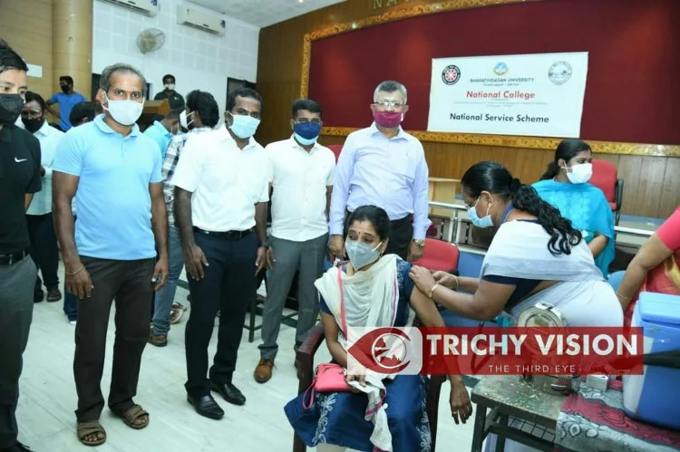 திருச்சி தேசிய கல்லூரியின் நாட்டு நலப்பணித் திட்டம் சார்பாக கொரோனா தடுப்பூசி முகாம் இன்று 25.06.2021 காலை கல்லூரி கலையரங்கத்தில் நடைபெற்றது . முகாமை கல்லூரி முதல்வர் முனைவர் சுந்தர்ராமன் தொடங்கி வைத்தார்.