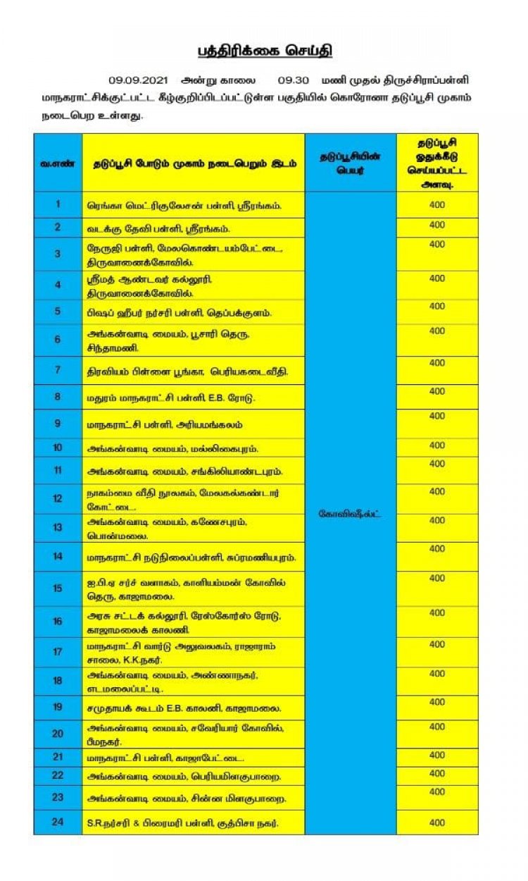 திருச்சி மாநகரில் நாளை(09.09.2021) கோவிட் தடுப்பூசி போடப்பட இடங்களை மாநகராட்சி நிர்வாகம் அறிவித்துள்ளது.