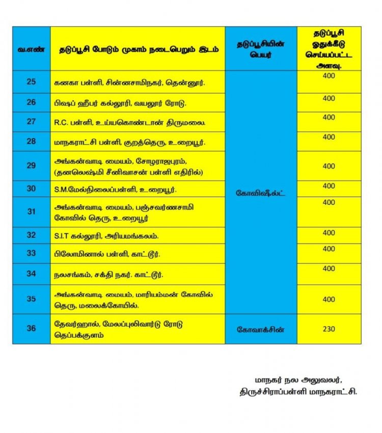திருச்சி மாநகராட்சியில் மொத்தம் 35 இடங்களில் 14,000 கோவிசீல்டு தடுப்பூசிகளும் ஒரே ஒரு இடத்தில் தேவர்ஹாலில் கோவாக்சின் தடுப்பூசி போடப்படும் என மாநகராட்சி நகர்நல அலுவலர் அறிவித்துள்ளார்.