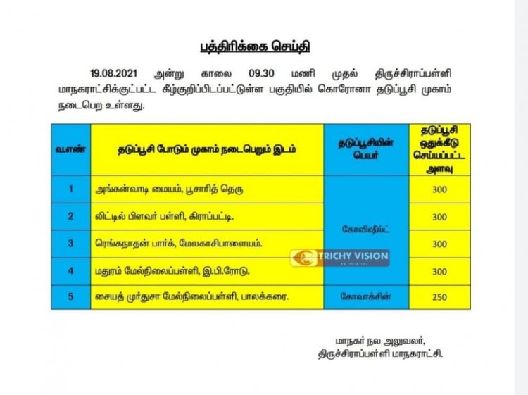 திருச்சி மாநகராட்சி பகுதியில் நாளை (19.08.2021)கோவிட் தடுப்பூசி போடப்படும் இடங்களை மாநகராட்சி அறிவித்துள்ளது.