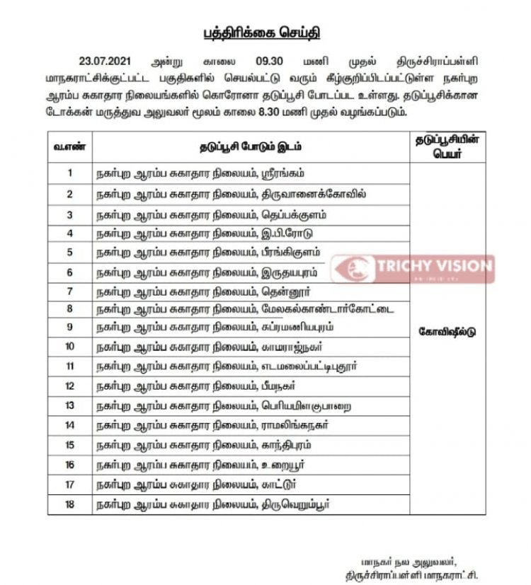 திருச்சி மாநகரில் நாளை(23.07.2021) கோவிசீல்டு தடுப்பூசி போடப்படும் இடங்களை மாநகராட்சி அறிவித்துள்ளது.