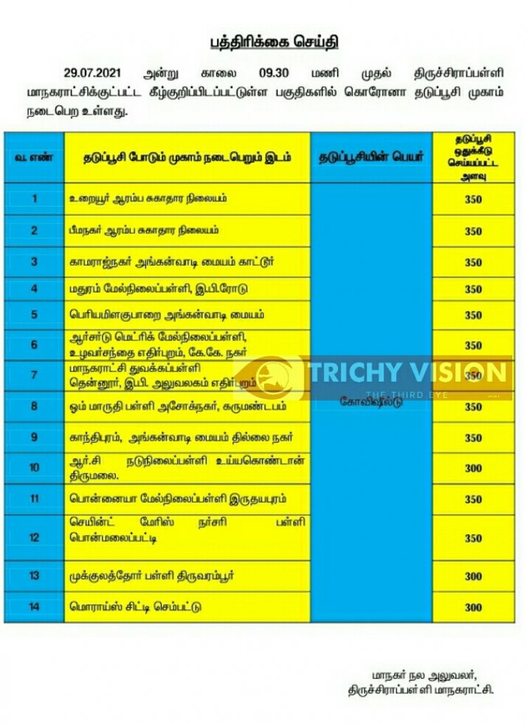 திருச்சி மாநகர்  பகுதிகளில் நாளை (29.07.2021)கோவிட் தடுப்பூசி போடப்படும் இடங்களை மாநகராட்சி அறிவித்துள்ளது.