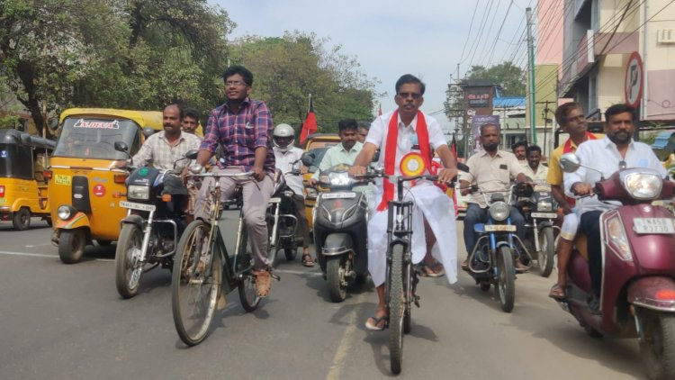 இந்நிலையில் திருச்சி மாநகராட்சி 23 வது வார்டில் போட்டியிட்ட இந்திய கம்யூனிஸ்ட் கட்சியின் வேட்பாளர் சுரேஷ் வெற்றி பெற்றார். இன்று மாமன்ற உறுப்பினராக திருச்சி மாநகராட்சி அலுவலகத்திற்கு பதவி ஏற்க சைக்கிளில் வந்தார் .அவருடன் கம்யூனிஸ்ட் கட்சித் தொண்டர்களும் சைக்கிள் இருசக்கர வாகனத்தில் வந்தனர்.