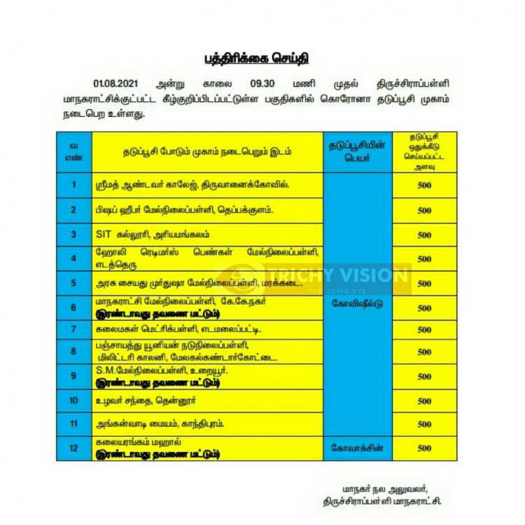 திருச்சி மாநகரில் நாளை (01.08.2021) கோவிசீல்டு 5500 தடுப்பூசிகளும், கோவாக்சின் 500 தடுப்பூசிகளும் போடப்படும் என மாநகராட்சி நிர்வாகம் தெரிவித்துள்ளது.