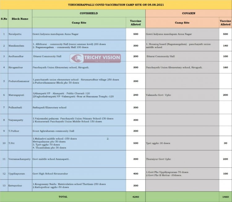 திருச்சி மாவட்டத்தில் நாளை (05.08.2021) கோவிசீல்டு, கோவாக்சின் தடுப்பு ஊசிகள் போடப்படும் இடங்களை மாவட்ட நிர்வாகம் அறிவித்துள்ளது.