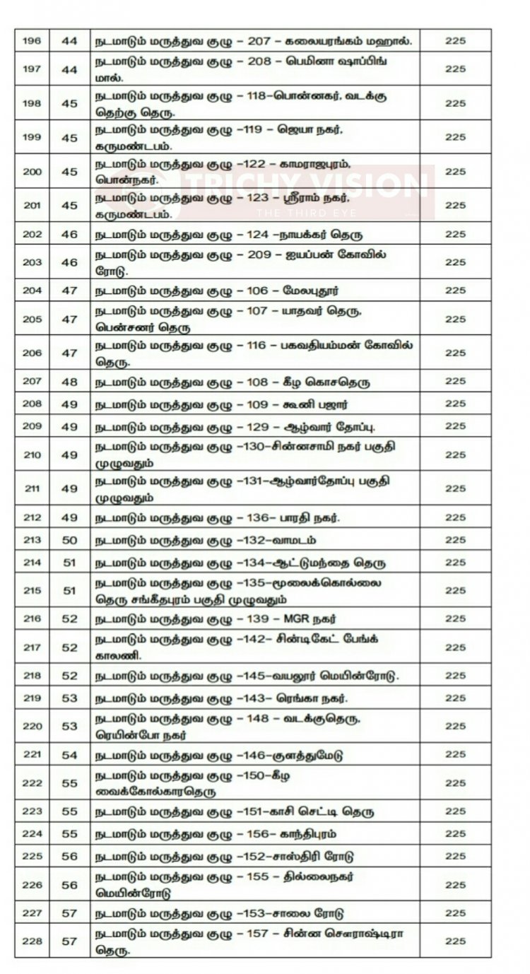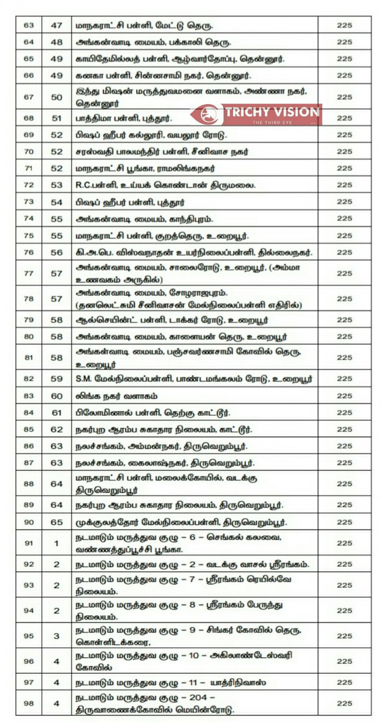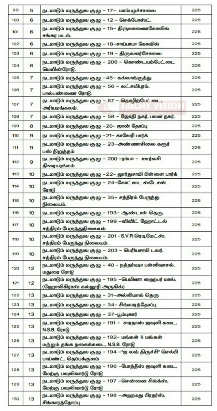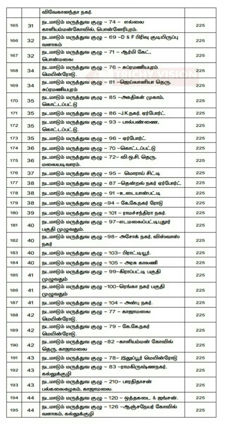 திருச்சி மாநகரில் 250 இடங்களில் நாளை (30.10.2021) கோவிட் தடுப்பூசி போடப்படும் இடங்கள்