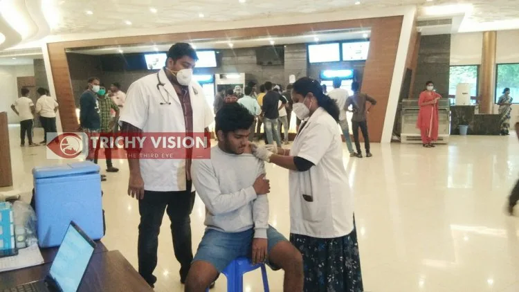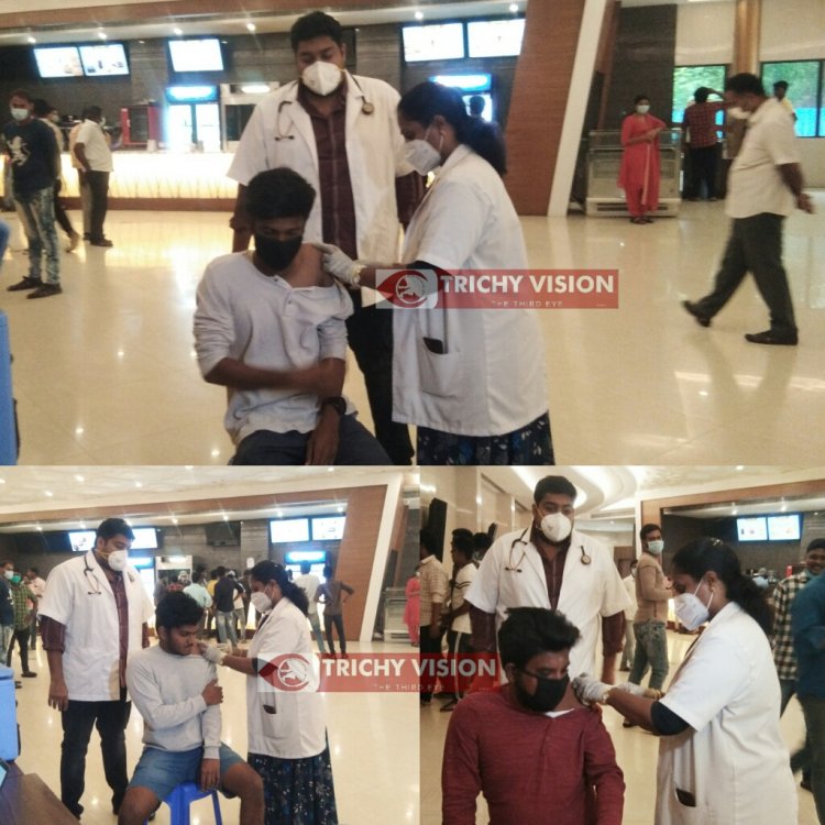 அதன்படி திருச்சியில் தினமும் மாநகர் மற்றும் புறநகர்களில் கோவிட் தடுப்பூசி செலுத்தும் விபரத்தை மாவட்ட மற்றும் மாநகராட்சி நிர்வாகம் அறிவிப்பு வெளியிடுகிறது. இதன் ஒருபகுதியாக இன்று திருச்சி கோட்டை ரயில் நிலையம் எதிரே உள்ள எல். ஏ. சினிமாஸ் திரையரங்கில் பார்வையாளர்களுக்கு தடுப்பூசி செலுத்தப்பட்டது.