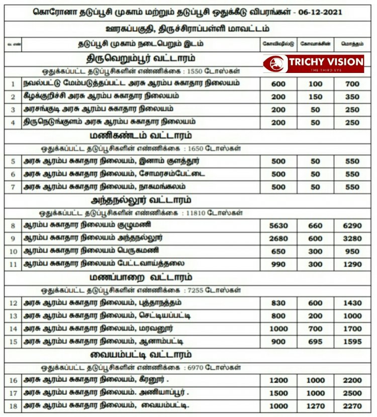 திருச்சி மாவட்டத்தில் இன்று (06.12.2021) கோவிசீல்டு, கோவாக்சின் தடுப்பு ஊசிகள் போடப்படும் இடங்களை மாவட்ட நிர்வாகம் அறிவித்துள்ளது.