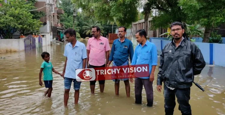 திருச்சிராப்பள்ளி மாநகராட்சி பகுதிக்குட்பட்ட 60வது வார்டு பகுதிகள் பாத்திமா நகர், செல்வ நகர் ,மங்கள் நகர், அகிலாண்டேஸ்வரி நகர் உள்ளிட்ட பகுதிகளின் தெருக்களிலும் வீடுகளுக்குள்ளும் தொடர் மழையாலும், கோரை ஆற்றில் ஓடும் நீரால் வடிகால்களால் வழிந்தோடிய நீரால் முழங்கால் அளவு தண்ணீர் சூழ்ந்துள்ளது. கடந்த 4 நாட்களாக மழைநீர் வடியாத நிலை உள்ளது. இப்பகுதிகளை இந்திய கம்யூனிஸ்ட் கட்சியின் திருச்சி மாநகர் மாவட்ட முன்னாள் செயலாளர் சுரேஷ் நிர்வாக குழு உறுப்பினர் சிவா மேற்குப் பகுதி செயலாளர் முரளி துணைச் செயலாளர் சரண்சிங் பொருளாளர் ரவீந்திரன் மாவட்ட குழு உறுப்பினர் இப்ராகிம் பகுதி குழு உறுப்பினர்கள் ஆனந்தன், நாகராஜ் உள்ளிட்டவர்கள் நேரில் சென்று பார்வையிட்டனர்.