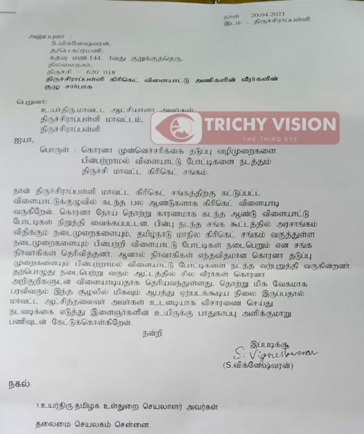இந்நிலையில் திருச்சி மாவட்ட ஆட்சியர் திவ்யதர்ஷினியிடம் திருச்சி கிரிக்கெட் சங்கத்தின் குழு சார்பாக விக்னேஸ்வரன் என்பவர் மனு அளித்துள்ளார். மனுவில் கொரோனா இரண்டாவது அலை காரணமாக இப்போது போட்டி நடத்த கூடாது .இதனால் போட்டியில் பங்கேற்க்கும் வீரர்கள் மற்றும் போட்டி நடத்துபவர்களுக்கு கோவிட் தொற்று பரவும் நிலை ஏற்பட்டுள்ளது . ஆகவே உடனடியாக போட்டிகளை நிறுத்த வேண்டும் என கோரிக்கை வைத்துள்ளார். இம்மனுவினால் திருச்சிராப்பள்ளி கிரிக்கெட் சங்கத்திற்குள் தற்போது குழப்பம் ஏற்பட்டுள்ளது.