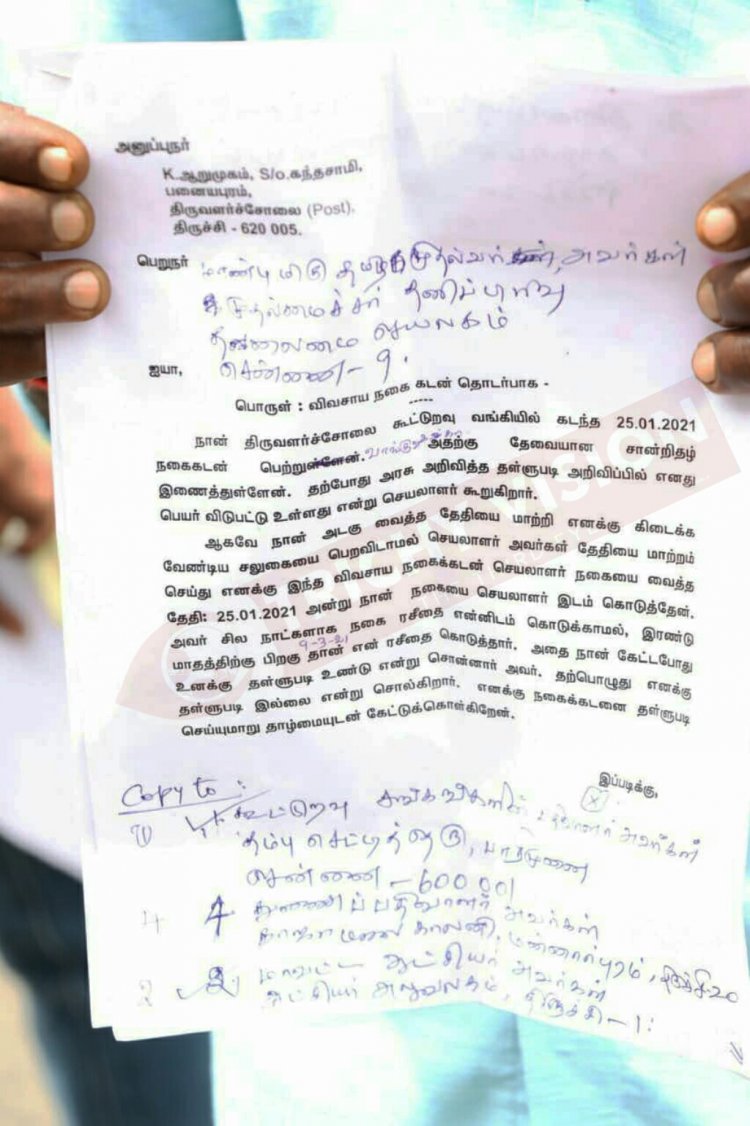 கடந்த மார்ச் 31-ஆம் தேதி வரை கூட்டுறவு வங்கியில் வைக்கப்பட்ட நகை கடன், விவசாய கடன் தள்ளுபடி செய்யப்படும் என தமிழக முதலமைச்சர் மு.க.ஸ்டாலின் அறிவித்துள்ள நிலையில், திருச்சி திருவளர்சோலை கூட்டுறவு வங்கியில் கடந்த ஜனவரி 25 அன்று பட்டா, அடங்கல் உள்ளிட்ட சான்றுடன், சுமார் 8 1/2 பவுன் நகையை ஆறுமுகம் என்ற விவசாயி அடகு வைத்துள்ளார்.