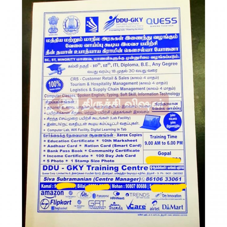 திருச்சி தீரன் நகரில் செயல்பட்டு வரும் DDU-GKY ட்ரெய்னிங் சென்டரில் மத்திய மற்றும் மாநில அரசுகள் இணைந்து வழங்கும் வேலைவாய்ப்பு கூடிய இலவச பயிற்சி அடுத்த மாதம் தொடங்க உள்ளது.CRS -customer retail&sales,