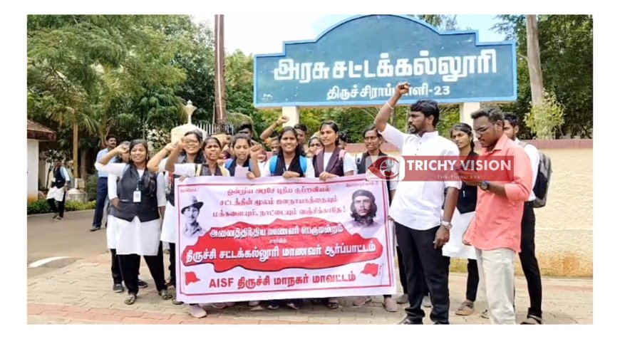 இதன் ஒரு பகுதியாக இன்று அனைத்திந்திய மாணவர் பெருமன்றம் சார்பில் திருச்சி காஜாமலையில் உள்ள அரசு சட்டக் கல்லூரியின் முன்பு மாணவ மாணவிகள் புதிய சட்ட திருத்தங்களையும் திரும்ப பெற வலியுறுத்தி கண்டன ஆர்ப்பாட்டத்தில் ஈடுபட்டனர்.