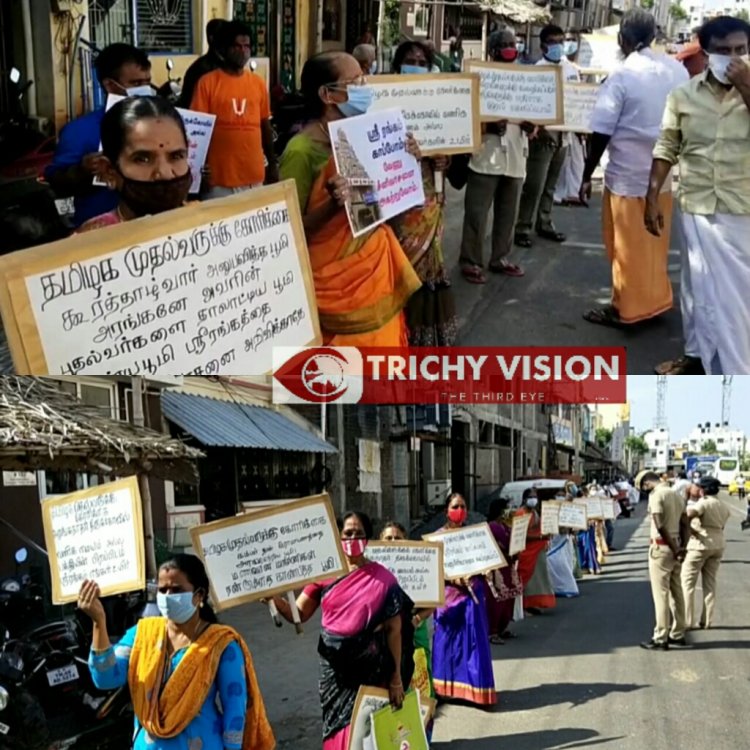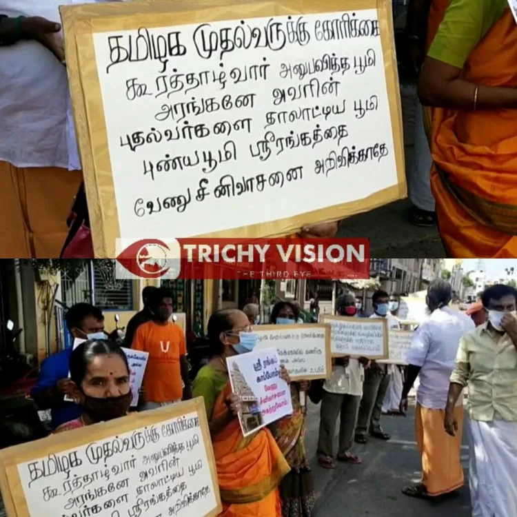 திருக்கோயில் பணியாளர்கள் அல்லது ஒரு தனி நபரிடம் ஊதியம் பெற்றுக் கொண்டு பணியாற்றி வரும் நபர்களை உடனடியாக வெளியேற்ற வேண்டும், பூஜா காலங்கள், உள்துறை நிர்வாகம் ஆகியவை மரபுமாறாது சுவாமி இராமானுஜர் ஆணைப்படி நடைபெற வேண்டும் உள்ளிட்ட கோரிக்கைகளை வலியுறுத்தி அரங்கம் பாதுகாப்பு பேரவையினர் ஶ்ரீரங்கம் வெள்ளைக்கோபுரம் முன்பு கோரிக்கை பாதகைகளுடன் ஆர்ப்பாட்டம் நடத்தினர்.