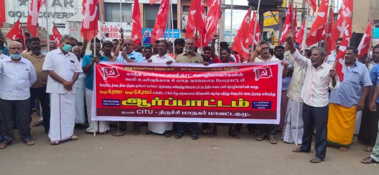 இது தொடர்பாக திருச்சி காந்தி மார்க்கெட் காவல்துறையினர் சிஐடியு தொழிற்சங்க நிர்வாகிகள் ராமர் மற்றும் ராஜா உள்ளிட்ட 9 பேர் மீது ஜாமீனில் வெளியே வரமுடியாத உள்ளிட்ட 8 பிரிவின் கீழ் வழக்கு பதிவு செய்து கைது செய்து திருச்சி மத்திய சிறையில் அடைத்தனர். இதனை கண்டித்து இன்று திருச்சி ராமகிருஷ்ணா மேம்பாலம் அருகில் சிஐடியூ சங்கத்தின் மாவட்டச் செயலாளர் ரங்கராஜன் தலைமையில் கண்டன ஆர்ப்பாட்டம் நடைபெற்றது. ஆர்ப்பாட்டத்தில் கைது செய்யப்பட்ட ராஜா, ராமன் உட்பட 9 பேரை உடனடியாக விடுதலை செய்ய வேண்டும்.