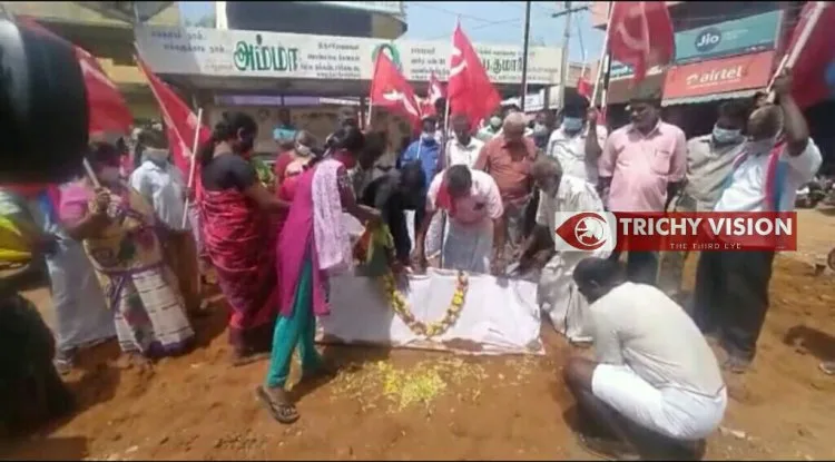 ராஜீவ் காந்தி நகரின் பின்புறமுள்ள விளை நிலத்தை பிளாட்போட்டு விற்பனை செய்வதற்காக 150 அடிக்கு மேல் தீண்டாமை சுவர் கட்டியவர்கள் மீது உரிய நடவடிக்கை எடுக்க வேண்டும் என்பதை வலியுறுத்தியும் மார்க்ஸிஸ்ட் கம்யூனிஸ்ட் கட்சி சார்பில் மேலகல்கண்டார் கோட்டை மாநகராட்சி அலுவலகம் முன்பு சமாதி கட்டி நூதன முறையில் ஆர்ப்பாட்டத்தில் ஈடுபட்டனர்.