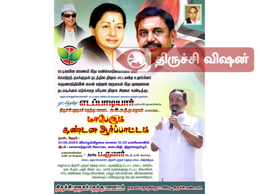 திருச்சி புறநகர் தெற்கு மாவட்ட கழக அஇஅதிமுக சார்பில் மாபெரும் கண்டன ஆர்ப்பாட்டம். நாளை (01.02.2024) வியாழக்கிழமை. காலை 10:00 மணியளவில் வாளவந்தான்கோட்டை, கடைவீதியில் நடைபெற உள்ளது. இந்த ஆர்பாட்டத்திற்கு திருச்சி புறநகர் தெற்கு மாவட்ட கழக செயலாளர் ப.குமார் தலைமையேற்று கண்டன உரையாற்றுகிறார்.