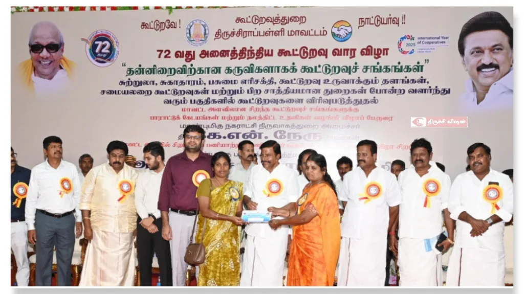 இவ்விழாவில் “தன்னிறைவிற்கான கருவிகளாகக் கூட்டுறவுச் சங்கங்கள் ” திகழவேண்டும் என்ற இலக்குடன், சுற்றுலா, சுகாதாரம், பசுமை எரிசக்தி, கூட்டுறவு உருவாக்கும் தளங்கள், சமையலறை கூட்டுறவுகள் மற்றும் பிற சாத்தியமான துறைகள் போன்ற வளர்ந்து வரும் பகுதிகளில் கூட்டுறவுகளை விரிவுபடுத்துதல் போன்ற பணிகளுக்காக, மாவட்ட அளவில் தேர்ந்தெடுக்கப்பட்ட சிறந்த கூட்டுறவு சங்கங்களுக்கு பாராட்டுக்கேடயங்கள் மற்றும் நலத்திட்ட உதவிகளை, நகராட்சி நிர்வாகத்துறை அமைச்சர் கே.என்.நேரு வழங்கினார்.
