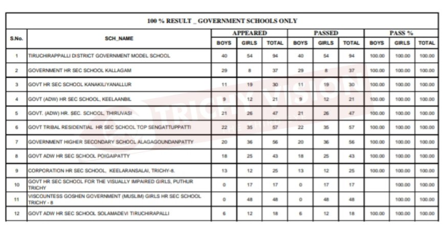 20223 ஆம் கல்வி ஆண்டிற்கான மேல்நிலை இரண்டாம் வகுப்பு பொதுத் தேர்வில் திருச்சிராப்பள்ளி மாவட்டத்தில் 258 பள்ளிகளை சேர்ந்த 14,390 மாணவர்களும், 16,520 மாணவிகள் என மொத்தம் 30, 910 மாணவ, மாணவியர்கள் தேர்வு எழுதினர்.