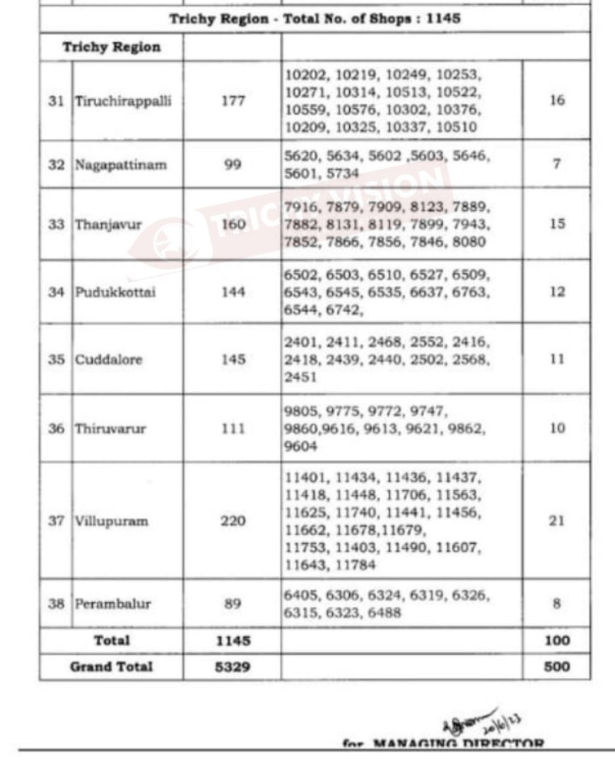குறிப்பாக திருச்சி மண்டலத்தில் நாளை (22.06.2023) முதல் நிரந்தரமாக மூடப்படும் டாஸ்மாக் கடை எண்கள் வெளியிடப்பட்டுள்ளது.