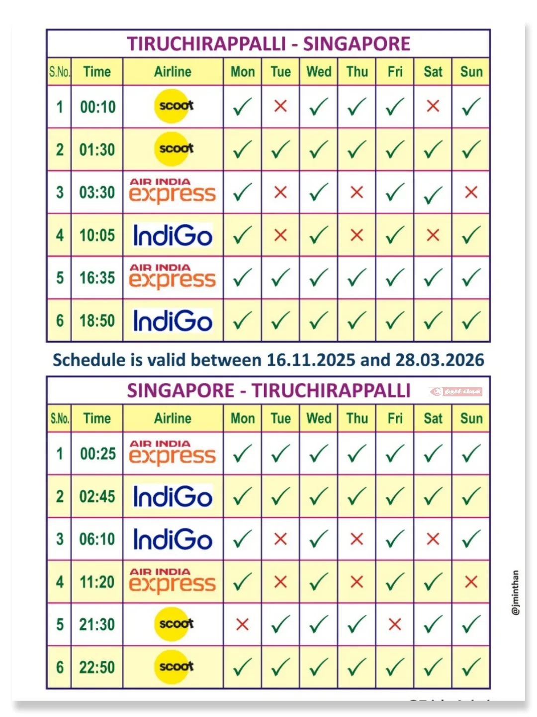 திருச்சிராப்பள்ளி சர்வதேச விமான நிலையத்திலிருந்து சிங்கப்பூர் நோக்கி மற்றும் சிங்கப்பூரிலிருந்து திருச்சிக்கு வரும் புதிய விமான அட்டவணை வெளியிடப்பட்டுள்ளது.