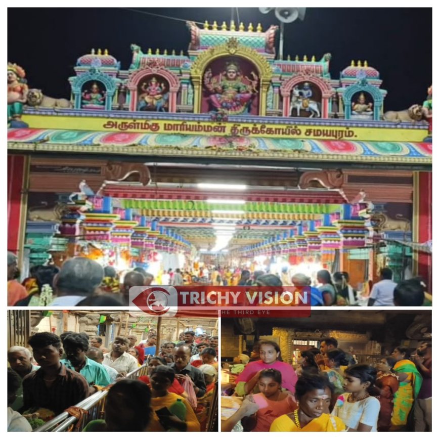 சக்தி தலங்களில் பிரசித்தி பெற்றதும், முதன்மையானதுமான திருச்சி மாவட்டம் சமயபுரம் மாரியம்மன் கோவிலில் ஆடி முதல் வெள்ளிக்கிழமையான இன்று அதிகாலை முதலே திருச்சி மாவட்டம் மட்டுமல்லாது பெரம்பலூர், அரியலூர், புதுக்கோட்டை, கரூர், கோயமுத்தூர் உள்ளிட்ட தமிழ்நாட்டின் பல்வேறு மாவட்டங்களில் இருந்து பல்லாயிரக்கணக்கான பக்தர்கள் வருகை தந்து நீண்ட வரிசையில் காத்திருந்து சாமி தரிசனம் செய்து வருகின்றனர்.