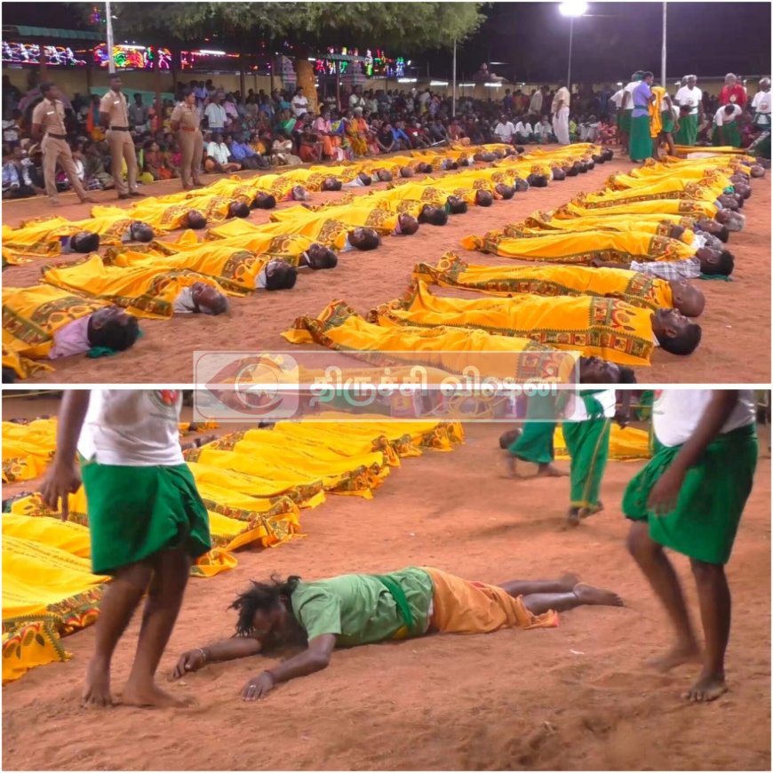 இந்த நிகழ்வைக்காணபல்லாயிரக்கணக்கான மக்கள் குவிந்திருந்தனர். நள்ளிரவில் பலரும் திடீர் திடீரென மயங்கி விழவே உடனே அங்கு கோவில் தொண்டாற்றும் ஊழியர்கள் மயங்கியவர்களை தூக்கி வந்து ஆலயம் முன்பு வரிசையாக படுக்க வைத்து மஞ்சள் துணியை போர்த்தி வைத்தனர். இதையடுத்து அதிகாலை அம்மன் பூ பல்லக்கில் பவனி வந்த பின் சிறுமி ஒருவர் அருள் வந்து ஆடிய படி அம்மனை நோக்கி செல்லவே பின்னர் வழிபாடுகளுக்கு பின் சிறுமி தீர்த்தக்குடத்தை எடுத்துக் கொண்டு மயங்கிய நிலையில் வரிசையாக படுக்க வைக்கப்பட்டிருந்தவர்களை சுற்றி வந்த பின் தீர்த்தம் தெளிக்கவே, தங்கள் மீது தீர்த்தம் பட்டதும் படுத்திருந்தவர்கள் துள்ளிக் குதித்துக் கொண்டு எழுந்து சென்றனர்.