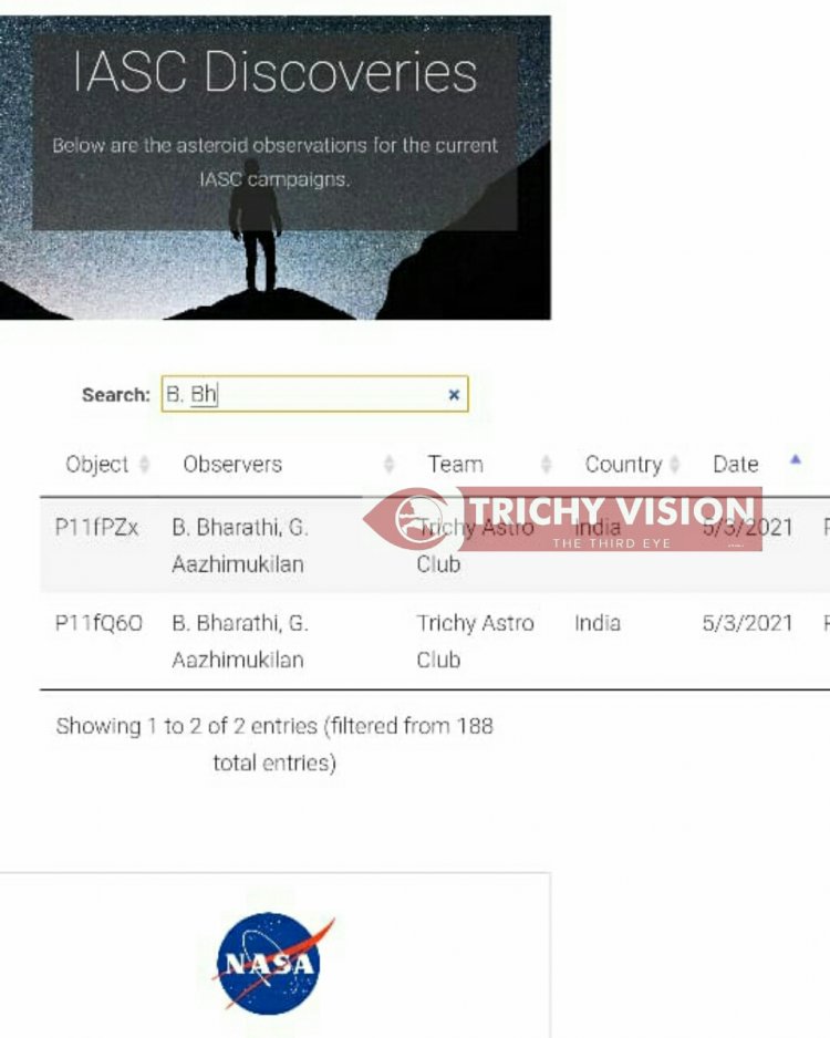 சென்ற மாதம் நடைபெற்ற பயிற்சியில் தமிழகத்திலிருந்து நான்குபேர்களைக் கொண்ட ‘திருச்சி ஆஸ்ட்ரோ கிளப்’ என்ற அணி மட்டுமே கலந்துகொண்டது. திருச்சி கே.கே. நகர் பாரதி மெட்ரிக் மேல்நிலைப் பள்ளி முதல்வர் பாலா பாரதியும், தூயவளனார் கல்லூரி முதலாமாண்டு இயற்பியல் துறை மாணவர் ஆழி முகிலனும் இணைந்து மூன்று குறுங்கோள்களைக் கண்டுபிடித்துள்ளனர். இவர்களின் கண்டுபிடிப்பை அங்கீகரித்து நாசா சான்றிதழ் அளித்துள்ளது. திருச்சியிலிருந்து மூன்று குறுங்கோள்கள் கண்டுபிடிப்பு. தமிழகத்திலிருந்து மூன்று குறுங்கோள்கள் கண்டுபிடிப்பு ஆசிரியரும் மாணவரும் கண்டுபிடித்த மூன்று குறுங்கோள்கள்.