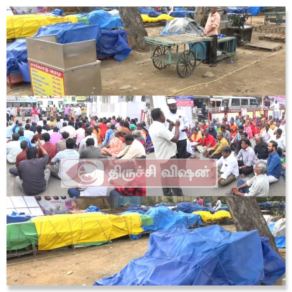 திருச்சி மலைக்கோட்டை தெப்பக்குளத்தை சுற்றியுள்ள பகுதிகளில் விற்பனை செய்யக்கூடாத இடமாக அறிவித்து அங்குள்ள கடைகளை அகற்றவும், தற்போது சாலை வர வியாபாரம் நடத்தி வரும் கடைகளுக்கு உரிய மாற்றிய இடம் வழங்கவும் சென்னை உயர்நீதிமன்ற மதுரை கிளை உத்தரவிட்டது.இதனை அடுத்து திருச்சிராப்பள்ளி மாநகராட்சி ஆணையர் வெண்டிங் கமிட்டியுடன் நடத்திய ஆலோசனையில், தெப்பக்குளத்தை சுற்றி உள்ள பகுதியில் தற்போது சாலை வர வியாபாரம் நடத்தி வரும் கடைகளை ஹோலி கிராஸ் கல்லூரி அருகில் உள்ள பழைய நகராட்சி அலுவலக இடத்தில் மாற்றி அமைத்துக் கொள்ளவும், ஏனைய கடைகளை மாற்றி இடத்துக்கு மாற்றிக் கொள்ளவும் தீர்மானிக்கப்பட்டு உத்தரவு பிறப்பிக்கப்பட்டது.191 கடைகள் உள்ள நிலையில் தற்போது பழைய நகராட்சி அலுவலகத்தில் 148 கடைகள் மட்டுமே செயல்படமுடியும், இதில் வெண்டிங் கமிட்டியை சேர்ந்த தொழிற்சங்கத்தில் உள்ள தரைக்கடை வியாபாரிகளுக்கு முன்னுரிமை அளித்து கடை வழங்கியதற்கு எதிர்ப்பு தெரிவித்தும், வெண்டிங் கமிட்டி மூலம் அனைத்து தரைக்கடை வியாபாரிகளுக்கும் அடையாள அட்டை வழங்கப்பட்ட நிலையில், அடையாள அட்டை உள்ள அனைவருக்கும் உரிய முறையில் கடைகளை ஒதுக்கீடு செய்யாமல் தன்னிச்சையாக செயல்படுவதை கண்டித்தும் பல்வேறு தொழிற்சங்கங்களை சேர்ந்த தரைக்கடை வியாபாரிகள் தெப்பக்குளம் காந்தி சிலையின் அருகில் தர்ணா போராட்டத்தில் ஈடுபட்டு வருகின்றனர். தங்களுக்கு உரிய மாற்று கடை வழங்காவிட்டால் தொடர்ந்து தங்களது போராட்டத்தை தீவிர படுத்தவோம் அதேநேரம் தரைக்கிட வியாபாரிகளின் வாக்கு வங்கிகளை பெற்றுவிட்டு தரைக்கடை வியாபாரிகளுக்கு நேர்ந்த துயரங்களை சற்றும் கண்டு கொள்ளாமல் வேடிக்கை பார்க்கும் அமைச்சர்கள் வீடுகளில் அமர்ந்து போராடுவோம் என்றும் எச்சரிக்கையுடன் தெரிவித்துக் கொண்டனர்.