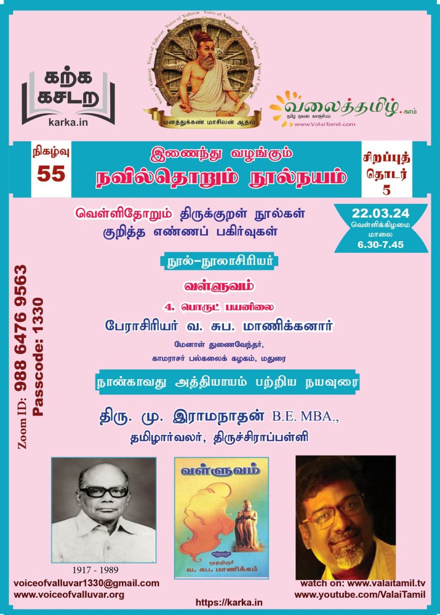 இணையதள வாயிலாக நடைபெறும் இந்நிகழ்ச்சியில் நூல் – நூலாசிரியர் குறிப்பு : நூலாசிரியர் பேராசிரியர் வ. சுப. மாணிக்கனார் சிந்தனையாளராக, கவிஞராக, உரைநடை ஆசிரியராக, நாடக ஆசிரியராக, ஆய்வாளராக, தமிழாகவே வாழ்ந்த தலைமகனாவார். வசுப, அண்ணாமலைப் பல்கலைக்கழகத்தின் தமிழ்துறைத் தலைவராகவும், அப்பல்கலைக்கழக இந்திய மொழிப்புல முதன்மையராகவும் பணி புரிந்தார். பின்னாளில் மதுரை காமராசர் பல்கலைக்கழக துணை வேந்தராகவும் அரும்பணி ஆற்றினார். குன்றக்குடி ஆதீனத்தால் ‘முதுபெரும் புலவர்’ என்ற பட்டம் வழங்கப் பெற்றவர். அதுவன்றி சன்மார்க்க சபையினர் அளித்த ‘செம்மல்’ பட்டமும் பெற்ற பெருமகனார். இவரது மறைவிற்குப் பின் தமிழ்நாடு அரசு ‘திருவள்ளுவர் விருது’ வழங்கி சிறப்பித்தது. ‘தமிழ் இமயம்’ என்று போற்றப்பட்ட இவர் நுண்மாண் நுழைபுலத்துடன் யாத்த ‘வள்ளுவம்’ என்னும் இந்நூலுள் பன்னிரண்டு சொற்பொழிவுக் கட்டுரைகள் அடங்கியுள்ளன. இவையாவும் தொடர் சொற்பொழிவுகளாக வள்ளுவரை முன்வைத்து, அவையோரை நோக்கிப் பேசினாற்போல் எழுதிய கற்பனைச் சொற்பொழிவுகளாகும்.
