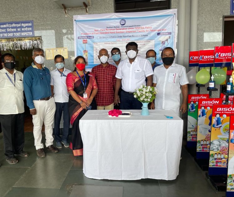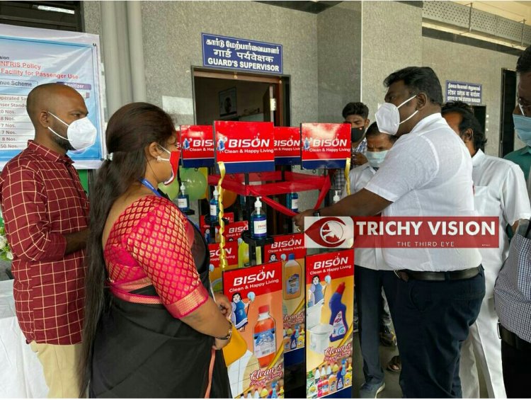 திருச்சி ரயில்வே ஜங்ஷன் நிலையத்தில் பயணிகள் பயன்பாட்டுக்கு கிருமிநாசினி வசதி அமைக்கப்பட்டுள்ளது. கொரோனா முன்னெச்சரிக்கை நடவடிக்கையாக திருச்சி ரயில் நிலையம் உட்பட திருச்சி ரயில்வே கோட்ட ரயில் நிலையங்களில் தனியார் அமைப்புடன் இணைந்து பயணிகள் காலால் மிதித்து கிருமிநாசினி பெறும் வசதி திருச்சி கோட்டம் சார்பில் செய்யப்பட்டுள்ளது.