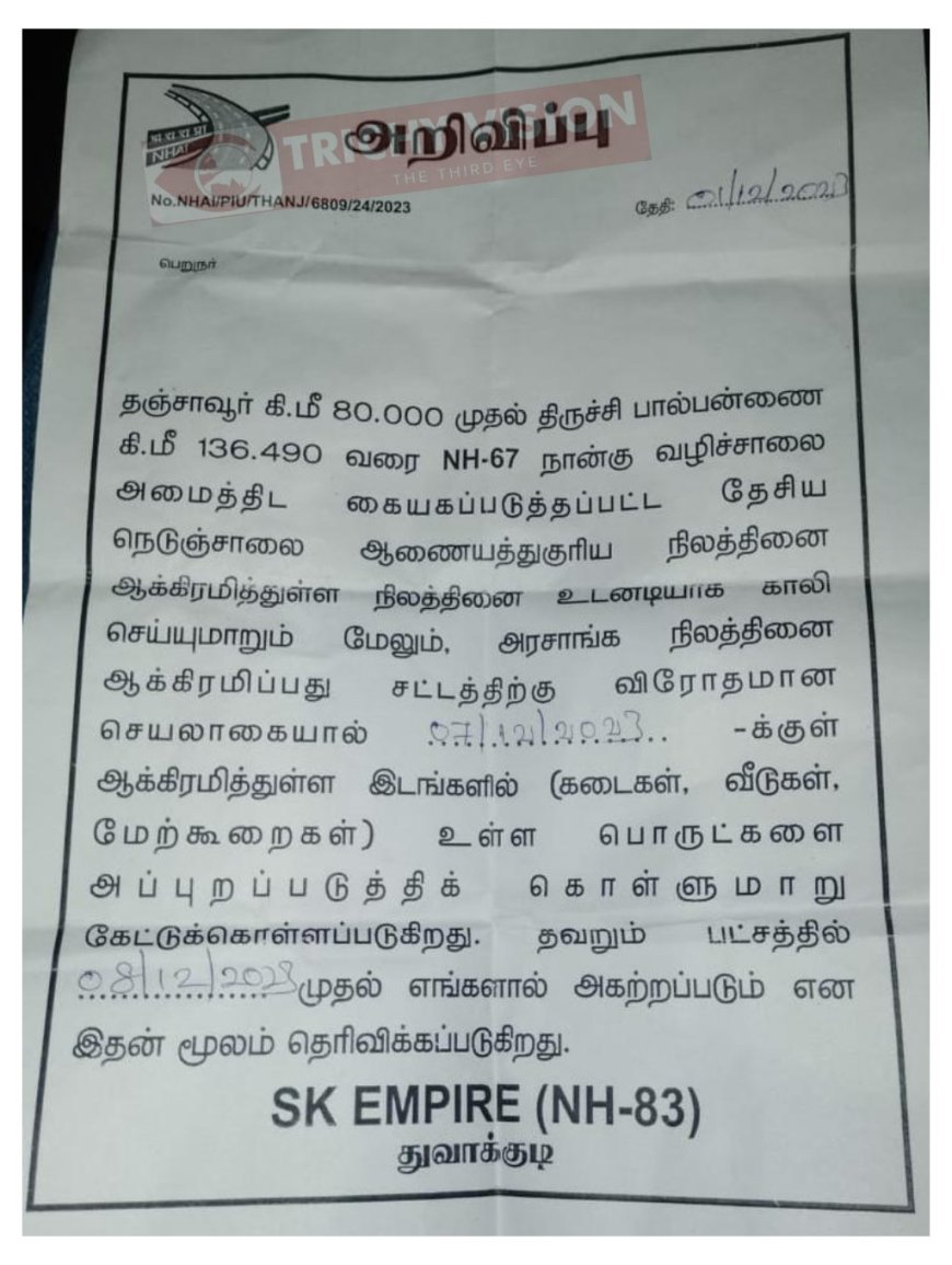 திருச்சி – தஞ்சை தேசிய நெடுஞ்சாலையை பராமரித்து வரும் தனியார் நிறுவனம் திருச்சி – தஞ்சை தேசிய நெடுஞ்சாலையில் ஆக்கிரமித்து கட்டப்பட்டுள்ள வணிக வளாகங்கள், கடைகள் மற்றும் வீடுகள் ஆகியவற்றை அப்புறப்படுத்தி கொள்வதற்கு நோட்டீஸில் குறிப்பிடப்பட்டுள்ளது .