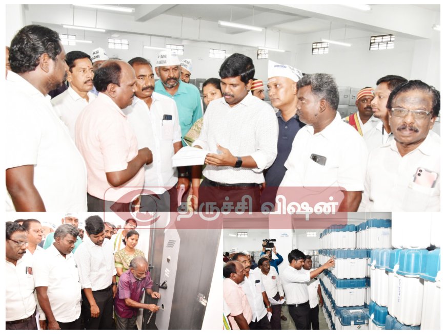 தேர்தல் வாக்குப்பதிவு இயந்திர வைப்பறையில் இருந்து வாக்குப்பதிவுக்கு கணினி வழி குழுக்கள் முறையில் தேர்வான வாக்குப்பதிவு இயந்திரங்களை அரசியல் கட்சி பிரமுகர்கள் முன்னிலையில் திருச்சியின் ஒன்பது சட்டமன்றத் தொகுதிகளுக்கு அனுப்பி வைக்கும் பணியை தேர்தல் அலுவலர் பிரதீப் குமார் ஆய்வு.