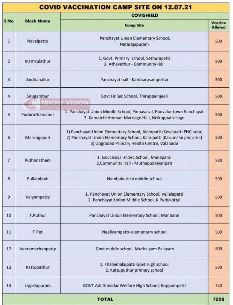 திருச்சி மாவட்டத்தில் உள்ள 14 யூனியன்களில் நாளை(12.07.2021) கோவிசீல்டு தடுப்பூசி போடப்படும் ஆட்சியர் அறிவிப்பு