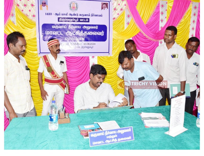 திருச்சி திருவெறும்பூர் வட்டாட்சியர் அலுவலகத்தில் இன்று முதல் மூன்று நாட்கள் ஜமாபந்தி நிகழ்ச்சி நடைபெறுகிறது. இதனை இன்று திருச்சி மாவட்ட ஆட்சியர் பிரதீப் குமார் ஜமாபந்தி நிகழ்ச்சி தொடங்கி வைத்தார். மேலும் பொதுமக்களிடம் குறைகளை கேட்டறிந்து தீர்வு காண நடவடிக்கை மேற்கொள்ளுமாறு அதிகாரிகளுக்கு வலியுறுத்தினார்.