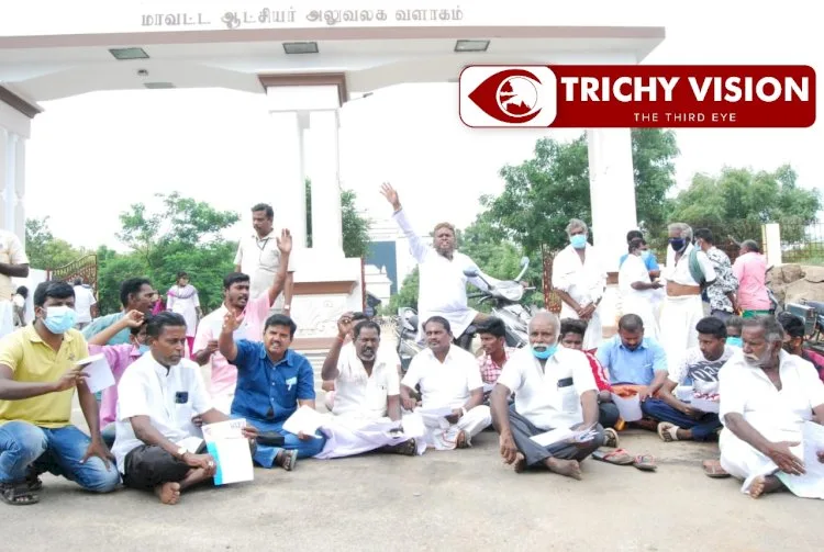 திருச்சி – மதுரை தேசிய நெடுஞ்சாலையில் உள்ள தரை கடைகளை அகற்றியதை கண்டித்து மாவட்ட ஆட்சியர் அலுவலகம் முன்பு தர்ணா!!