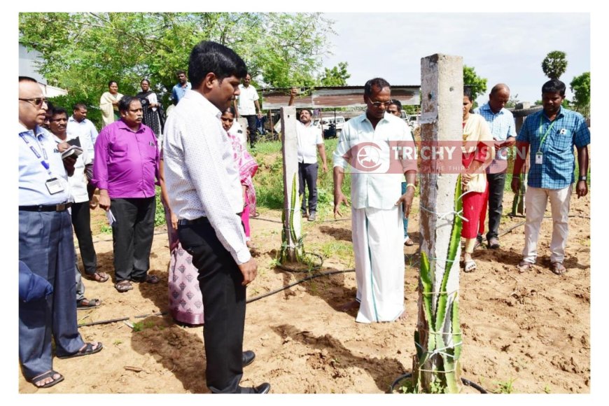 தொடர்ந்து இலால்குடி ஊராட்சி ஒன்றியம், பம்பரம்சுத்தி ஊராட்சியில் தோட்டக்கலைத்துறையின் சார்பில் தேசிய தோட்டக்கலை இயக்க திட்டத்தின் கீழ் நுண்நீர் பாசனம் அமைக்கப்பட்டு டிராகன் பழம் பரப்பு விரிவாக்கம் செய்யும் பணிகளையும், ஆலங்குடி மகாஜனம் ஊராட்சியில் வேளாண்மைத் துறையின் சார்பில் நெல் நாற்றங்கால் அமைக்கப்பட்டுள்ளதையும் மாவட்ட ஆட்சித்தலைவர் அவர்கள் நேரில் பார்வையிட்டு ஆய்வு செய்தார்.